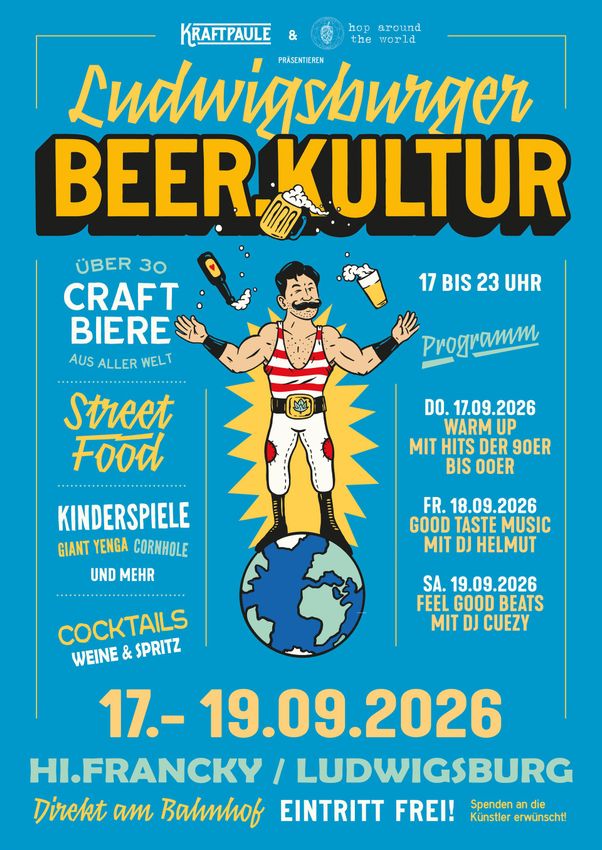 Schluß mit der öden Biermonotonie bei Festen! Die Ludwigsburger Beer.Kultur lädt ein Bierspezialitäten aus aller Welt zu probieren. Über 30 Stück werden vom Fass und in der Flasche geboten. An 3 Tagen veranstalten die Craft Beer Pioniere vom Kraftpaule aus Stuttgart und die neue Ludwigsburger Biermissionarin Vanessa von Hop Around The World dieses bunte Bierfest mit jeder Menge Spiel und Spaß für Groß und Klein. Für das leibliche Wohl ist mit veganer Pizza und leckeren Burgern ebenfalls gesorgt. Der Eintritt ist frei, also kommt Zuhauf und testet euch durch die nationale und internationale Biervielfalt.